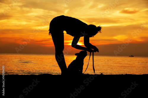 Woman With Her Cute Dog In The Beach On Golden Sunset Background