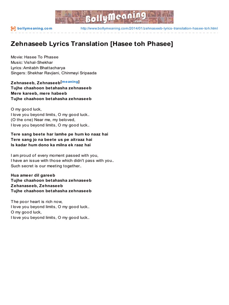 Bollymeaning Com Zehnaseeb Lyrics Translation Hasee Toh Phasee